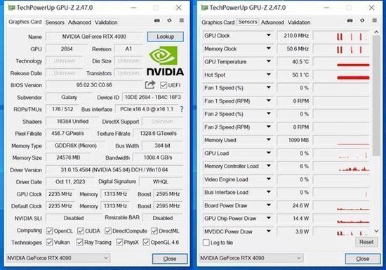 首先是检测软件GPU-Z可看到影驰 20周年GeForce RTX 4090的产品规格和基本参数,以及其待机温度为 40.5°C,功耗为24.6W。