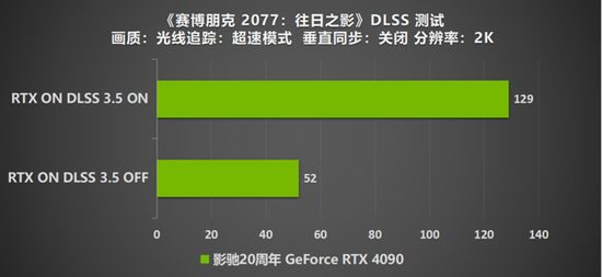 在2K分辨率下的影驰20周年 GeForce RTX 4090 凭借着自身的性能,在《赛博朋克2077: 往日之影》中开启"光线追踪:超速模式"也依旧可以达到52帧的成绩。玩家们在进行游戏时开启该模式,所获得的的游戏画面将会更趋近于真实,享受更加震撼的画面细节,但与此同时也将对于显卡拥有着巨大的压力。通过NVIDIA DLSS 3.5的加持,帧数进行了翻倍的增长,高达129帧。让玩家实现全景光线追踪下的高帧流畅游戏体验。