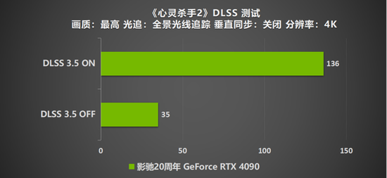 4K分辨下的影驰20周年 GeForce RTX 4090 也只能跑到35帧的成绩,由此可见该游戏的盛大以及对于显卡超高的要求。搭配开启NVIDIA DLSS 3.5技术后,帧数可以达到136帧的好成绩。