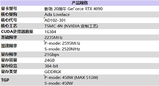 影驰 20周年 GeForce RTX 4090采用GeForce RTX 40系列全新、更高效的NVIDIA Ada Lovelace 架构核心,核心处理器型号为AD102-301。ADA架构为玩家提供顶级性能,可让游戏玩家和创作者在性能、AI 驱动图形领域以及其他领先的平台功能上实现质的飞跃,其提供的体验穿越速度,不止于快。该架构配备了第三代 RT Core 和第四代 Tensor Core,以及支持NVIDIA DLSS 3.5技术,其中包含超分辨率、DLAA、帧生成、光线重建等技术,为玩家们带来更为精致震撼的游戏画面,同时享有更加稳定的高帧体验,以确保使用影驰 20周年 GeForce RTX 4090的玩家们能够体验到目前为止最高的游戏体验。搭配此次最具亮点DUAL BIOS 一键切换功能,实现双应用场景。影驰 20周年 GeForce RTX 4090基础频率即达到了2235MHz,而DUAL BIOS 一键切换功能为玩家提供S-Mode 标准模式 和P-Mode 性能模式,加速频率下分别达到了2520MHz和2595HMz,极限超频,是玩家们进阶的必备之选!