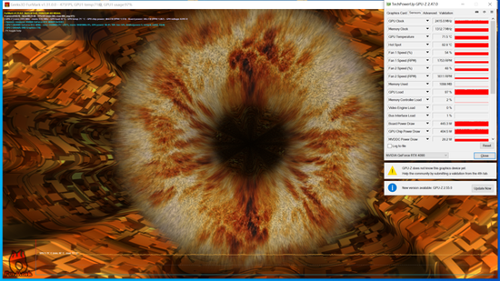 FurMark测试所提供的是显卡 GPU的功耗控制能力。开启FurMark后,需要经过一段时间等待温度与功耗数据稳定,最终所获得的结果即是影驰 20周年GeForce RTX 4090 GPU的功耗。数值为445.3W,温度为71.5℃。在满载功耗的情况下,影驰 20周年GeForce RTX 4090的温度依旧能保持在一个稳定的情况,该卡所设计的全新散热系统可谓是非常优异了。需要注意的是,该卡在满载时所需要的功耗达到445.3W,这里建议各位玩家和创作者们电源上的选择是使用功率为850W以上的电源设备。