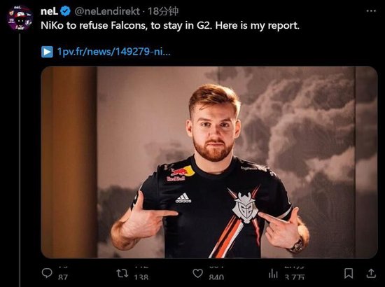 日前法媒1pv.fr记者neL表示,根据他的消息源,尽管Falcons和G2已经就NiKo转会达成一致,但波黑公子NiKo还是拒绝了Falcons战队的邀请。而随着NiKo继续留在G2,m0NESY也会在G2继续自己的职业生涯。