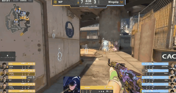 比赛来到Wings Up选择的Ancient,手枪局Wings Up选择爆弹进攻B区,MareK断掉后路回防的CT,包点2人凭借枪法成功拿下手枪局。NIP选择ECO,进入1V1后flying枪法失误,好在拆包时间不够,Wings Up连下三分。随后NIP迅速还以颜色,maxster火力全开,NIP凭借强势的B区连动,使得Wings Up始终难以进攻进去,比分来到8-3。上半场最后一局Wings Up迅速控制中路选择夹A成功拿下一分,8-4。