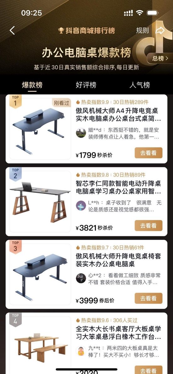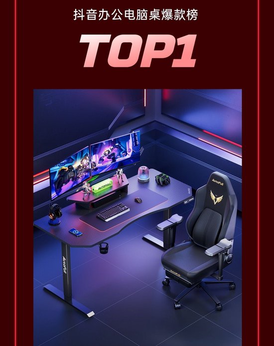 抖音榜单显示,傲风机械大师A4电竞桌,高居抖音办公电脑桌爆款榜·Top1;