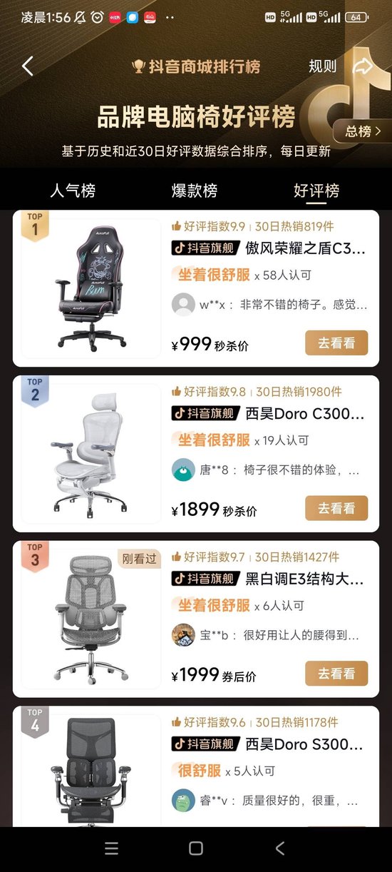 抖音榜单显示,傲风荣耀之盾C3系列,高居抖音品牌电脑椅好评榜·Top1;