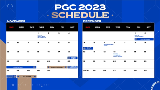 PGC2023将由小组赛,胜者组,败者组和最后机会阶段组成。在最初的32支战队中,前16的战队将晋级总决赛。