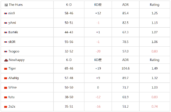 第二场比赛由The Huns对阵Newhappy。图一双方在防守方都展现出了极强的韧性,在防守方时双方展现出了精彩的配合,比赛也是你来我往,互有胜负,在比赛的最后,才分出第一局的胜负,在最后时刻,还是Tiger连续的发力,单局33-15的战绩帮助队伍拿下首局。图二的剧情和图一的走势几乎一样,但不同的是这次是The Huns笑到了最后,在yAmi和sk0R合力拿下41杀后,帮助队伍以13-11拿下图二。最后的图三,还是韧性更强的Newhappy笑到了最后,在双方一度战至10-9的情况下,SPine和AhaNg顶住了压力,两人合力拿下44杀,完成一锤定音,帮助队伍以13-10拿下图三,Newhappy以2-1拿下比赛。