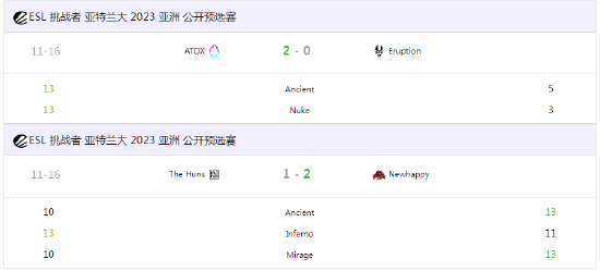 11月16日,在刚刚结束的ECL亚特兰大公开预选1/4决赛中,ATOX与Newhappy分别战胜Eruption与The Huns,成功晋级ECL亚特兰大封闭预选赛。