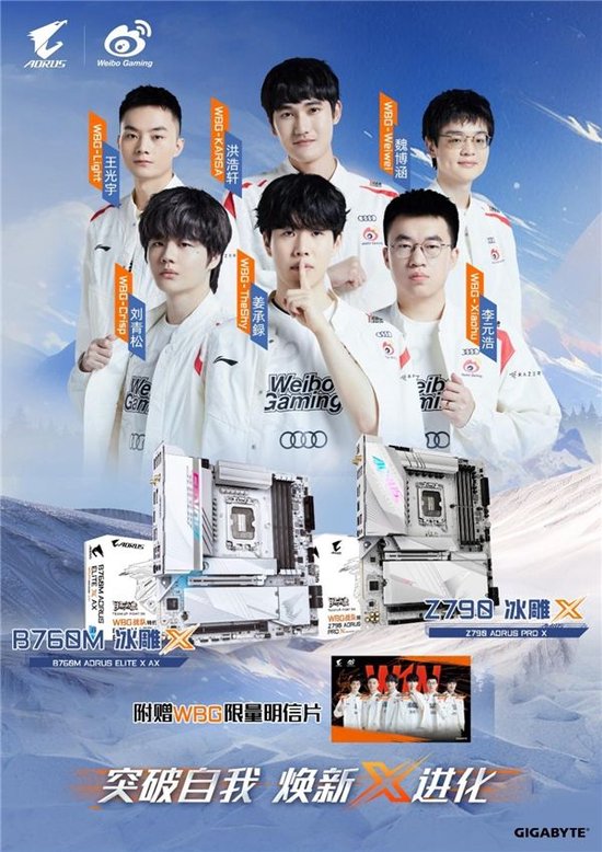 技嘉AORUS作为WBG英雄联盟分部特约合作伙伴,于近日发布两款WBG战队特约电竞主板,分别是Z790 冰雕X (Z790 AORUS PRO X)和B760M 冰雕 X (B760M AORUS ELITE X AX)。为了感谢粉丝们的支持,在这次的特约主板中额外增加了WBG战队的限量明信片。