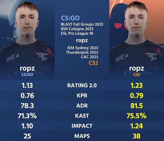 CS新版本的神,ropz当之无愧。根据数据爱好者statsmeister的统计,爱沙尼亚天才少年在CS新版本前三次赛事中平均各项数据明显高于最近三次CSGO大赛的平均数据。