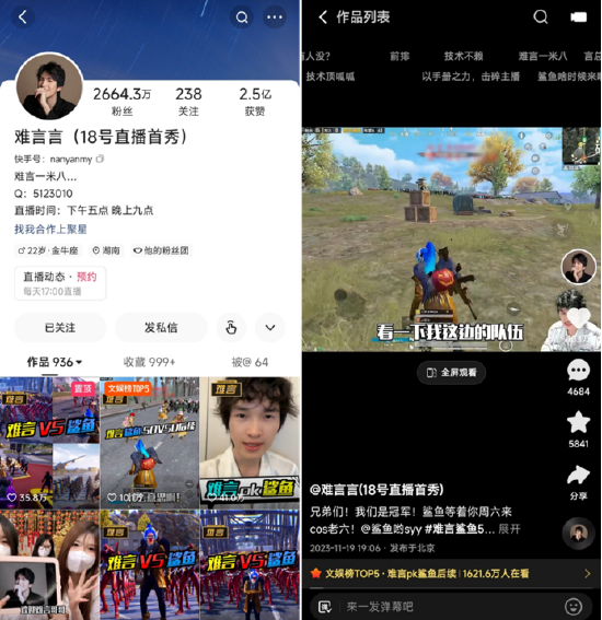 众所周知,快手独有的社区文化和氛围,让平台拥有极强的社交属性,主播与用户之间的互动更多——在主播为用户创造简单、直接、纯粹的快乐时,用户也与主播建立起更深度的情感连接。以难言为例,经过一场诚意十足的直播首秀,其快手账号@难言言 粉丝量便从2564万增长至2664万,再次实现头部主播与更多粉丝的双向奔赴。