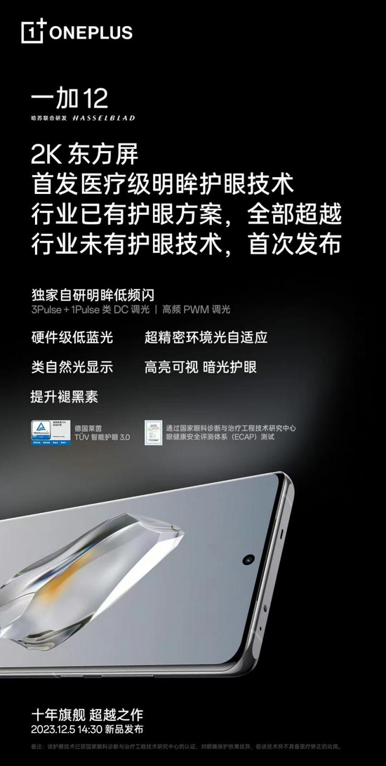 为满足用户日趋增长的护眼需求,一加聚集各方资源打造了首个医疗级护眼方案——「明眸护眼」技术,并由一加 12 首发搭载。一加 12 通过硬件级低蓝光、高频 PWM 调光、3Pulse+1Pulse 类 DC 调光、超精密环境光自适应等护眼举措,大幅降低了频闪、有害蓝光、暗光/强光环境对眼睛的伤害,首次在手机屏幕上实现医疗级的用眼保护,并获得了莱茵最高等级的智能护眼 3.0 认证和国家眼科诊断与治疗工程技术研究中心权威认证。