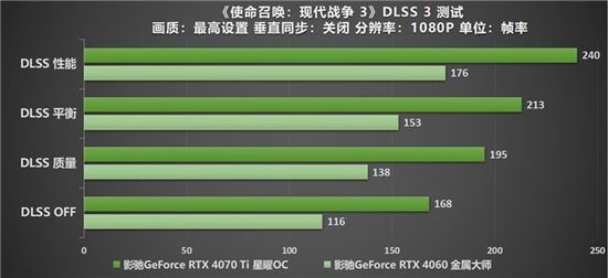 通过实际测试数据对比,不难发现《使命召唤:现代战争 III 2023》对于显卡的要求还是非常合理的,不会说要求特别的高。凭借着NVIDIA DLSS 3技术的加持,影驰GeForce RTX 4070 Ti 星曜OC以及影驰GeForce RTX 4060 金属大师 均能在4K分辨率下以最高画质流畅稳定的运行游戏。再次提醒玩家们,由于NVIDIA DLSS 3技术是RTX 40系列显卡独有的技术支持,拥有影驰GeForce RTX 40系列显卡的玩家才能尽情享受开启该技术后的高帧游戏体验哦!作为《使命召唤》系列的最新力作,《使命召唤:现代战争 III 2023》的发布可谓是聚齐了团队全部的结晶以及诚意,为玩家们不论是剧情,画面,地图亦或者是技术等等方面都带来了不一样的全新体验,致力于让玩家们畅享一场酣畅淋漓的战投博弈!同时,除了NVIDIA DLSS 3技术外,作为一款射击游戏怎么能少的了NVIDIA Reflex技术的加持呢!NVIDIA Reflex技术可以降低系统延迟,使玩家更迅速地作出反应,在多人竞技比赛中发挥出更佳水平,同时也能在单人游戏时获得更快的响应速度,提升游戏乐趣。目前,每月有超过 5000 万玩家使用 NVIDIA Reflex,在 10 大射击竞技游戏中,现已有 9 款支持 NVIDIA Reflex,在 80 多款NVIDIA Reflex 游戏中,有 90% 的 GeForce 玩家都已激活 NVIDIA Reflex。