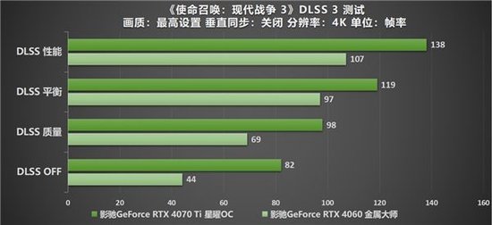 如果对于分辨率有着极致的要求的玩家们,在显卡上的选择也需要更加注意。在4K分辨率下的影驰GeForce RTX 4070 Ti 星曜OC 和 影驰GeForce RTX 4060金属大师 拥有着明显的差异。首先看到影驰GeForce RTX 4070 Ti 星曜OC,凭借着该卡自身的性能加持,依旧是可以流畅运行《使命召唤:现代战争 III 2023》这款游戏的,帧数达到了82帧。而选择影驰GeForce RTX 4060金属大师 的玩家们想要流畅游玩就显得有些许吃力了,帧数仅能来到44帧。但是通过NVIDIA DLSS 3技术强悍的加持,玩家们可以看到两张卡最高都能达到超越百帧的成绩,可以让玩家们无忧流畅的瞄准目标进行击败。在DLSS 3质量模式下,两张卡的成绩分别为98帧和69帧。在DLSS 3平衡模式下,影驰GeForce RTX 4070 Ti 星曜OC则能突破百帧达到119帧的成绩。影驰GeForce RTX 4060金属大师 的帧数对比起未开启DLSS 3技术时,上涨了53帧。均能稳定流畅的运行游戏。而在DLSS 3性能模式下,影驰GeForce RTX 4060金属大师 的帧数 则是达到了将近110帧的分数。影驰GeForce RTX 4070 Ti 星曜OC的表现更为优异,帧数达到了138帧。可谓是4K游玩《使命召唤:现代战争 III 2023》也毫无压力。