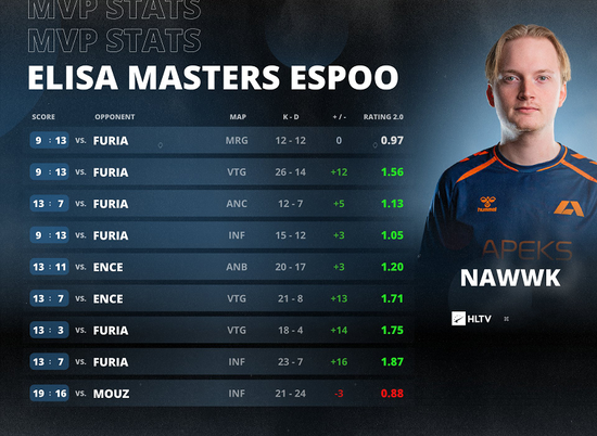 来自瑞典的职业选手nawwk赢得了自己人生中第一个MVP,虽然他们在埃斯波输掉了决赛,但是他依旧凭借自己超强的发挥争取到了这个荣誉。