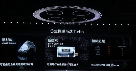 一加 12 全球首发与瑞声科技联合研发的仿生振感马达 Turbo。这颗仿生振感马达 Turbo 使用行业最先进的稀土磁性材料 N54 SH 磁钢,配合全球首发的行业最新第五代磁路技术 CSA+,在振动量、频宽、响应速度、振动丰富度等多维度全面超越 iPhone,为消费者带来了有生命力、符合直觉、不打扰的振感体验,马达体验再领先行业 1 年。