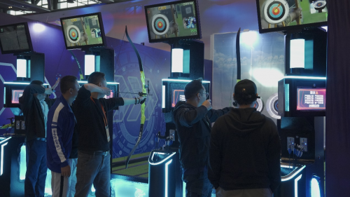 赛场上的骑行选手挥汗如雨,赛场下观众在玩着射箭和赛车游戏。如果不被告知,很多人可能都无法想象这是一个电竞赛事。