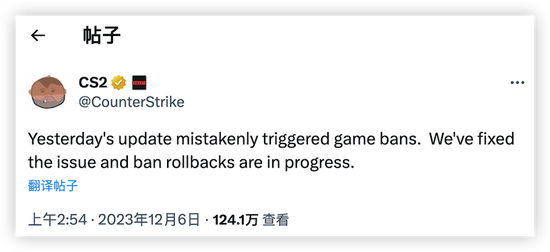 12月6日凌晨,CS官方推特发文,表示昨天的更新之后错误导致了许多游戏封禁(VAC),他们已经修复了这个问题,而玩家账户回滚也在进行当中。