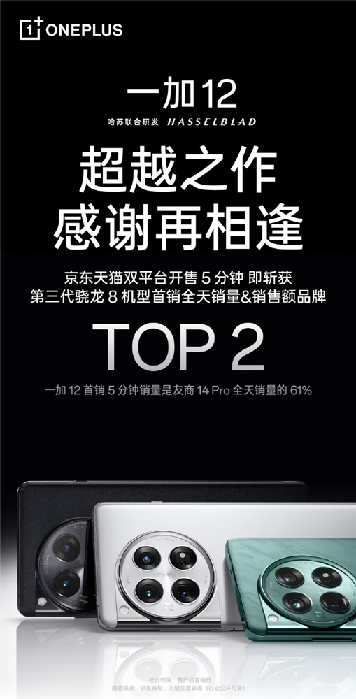 12 月 11 日 10:00,十年超越之作一加 12 正式开售,京东天猫双平台开售 5 分钟即斩获第三代骁龙 8 机型首销全天销量和销售额品牌 TOP 2,首销 5 分钟销量达成友商 14 Pro 全天销量的 61%。一加中国区总裁李杰表示:“ 一加 12 销量远远超出预期,这是「产品力优先」的胜利,一加会继续在这条道路上稳步前进。”