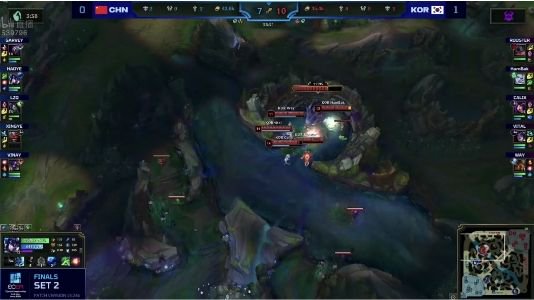 首局比赛,中国队选择了阿卡丽+鳄鱼的单线强势组合,韩国队则拿到盲僧、妮蔻和霞洛的团战组合。