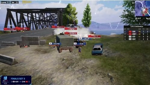 第一局,农场圈开局,中国队选择圈内集中发育,韩国队则分散在安全区外侧。第三阶段末尾,双方在农场南部山地遭遇,韩国队凭借更细致的站位补枪完成0换8大胜。
