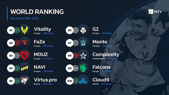1-10名中变动不小,凭借在BLAST 秋季决赛和全球总决赛的二连冠,Vitality取代FaZe成为目前世界排名第一的战队。至于Natus Vincere和Virtus.pro也挺进到前五当中。Cloud9上升一名成为前十守门员。值得注意的是,阵容刚刚搭建好的Falcons由于继承了ENCE核心阵容的积分,目前排名世界第九。