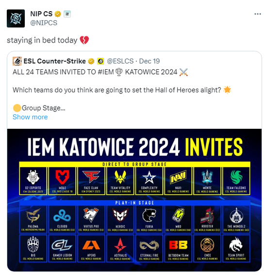 以下为IEM卡托维兹2024的直邀战队名单: