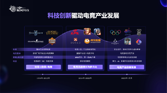 科技驱动的产业创新阶段(2023 年起)。这一阶段电竞与前沿科技如人工智能、算力与云计算、大数据等技术手段深度融合。这种融合不仅丰富了电竞的内容和形式,更为电竞产业的长远发展提供了新的动力和方向。