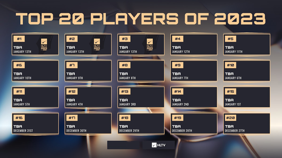 为了在颁奖典礼上公布最后三名选手,从12月27日开始到颁奖典礼前夕的1月12日,HLTV每天03:00都将公布一名选手。届时,2023年度最佳选手TOP1-3将于其他个人和团体荣誉奖项一同揭晓,同时颁发年度最佳选手奖项。