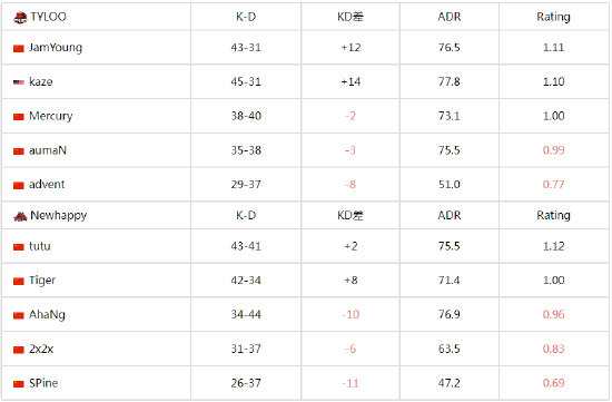 图一Nuke上双方都在进攻方打出了顺利的攻势,比赛一路拖进加时,加时赛中JamYoung和kaze依旧状态在线最终带领队伍拿下图一。图二先做防守的TYLOO成功在上半场打崩对手,取得10-2的领先。虽然下半场开始NewHappy放下心理压力开始逐渐追分,但是巨大的分差还是容错太小最终9-13输掉比赛。