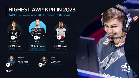 根据HLTV数据统计(筛选数据维度为2023年TOP20线下赛对局,地图样本容量数需大于60),在2023年AWP每回合击杀数榜单中,Spirit选手sh1ro以0.40 KPR高居榜首。排名第二、三名的分别是G2和MOUZ战队狙击手m0NESY和torzsi,分别有着0.39和0.38 KPR;device与Jame则是由于总击杀数较少位列第四、五名。