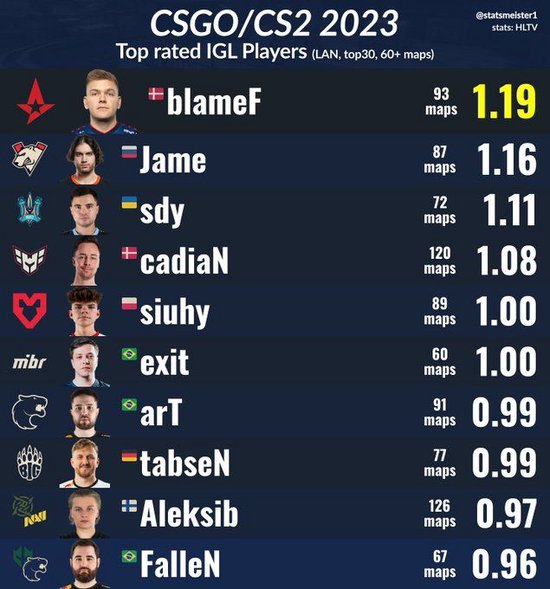 日前CSer统计了今年CS线下赛事、对阵Top20战队、地图样本量60+的指挥Rating排行榜。有意思的是,Benjamin Bremer | blameF以93张地图、1.19的rating位列第一。排名第二的是保枪的神Dzhami Ali | Jame,有着1.16的rating。第三名是Monte选手Viktor Orudzhev | sdy,72图1.11rating。
