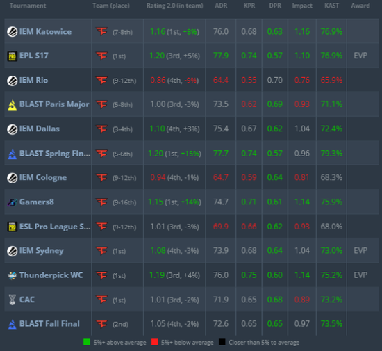 Twistzz各赛事数据,绿色为高于赛事平均5%以上,红色为低于平均5%以上,灰色为接近平均值