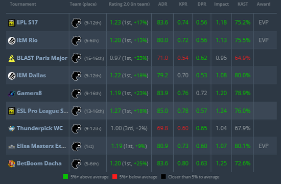团队的困境并没有阻碍这位巴西顶级步枪手再次取得出色的数据,但他还未能在对阵顶级战队的重要比赛中证明自己的价值,因此他在对阵顶级战队的出色数据在很大程度上发生在小组赛和声望较低的比赛中。