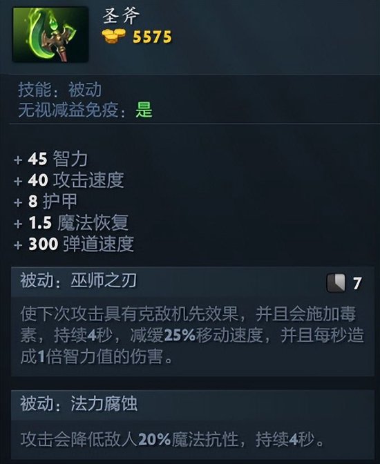 关于圣斧在之前的红黑榜中也有提及,旧版巫师之刃的上位合成英灵胸针对于大多数法系核心优先级并不高,毕竟除了风暴之灵那样能自己玩虚灵之刃+英灵胸针秒杀流,其他法系核心很难把旧版英灵胸针当核心大件来出。而圣斧的特效不仅是简单粗暴的降低敌人20%魔法抗性,甚至还给巫师之刃的9秒冷却时间缩短到了7秒,搭配上玲珑心直接变成5.3秒,几乎就要覆盖巫师之刃持续4秒的毒素时间。一个12级只有动力鞋的法系核心(如痛苦女王、帕克等)在出到圣斧之后的毒素伤害就能轻松打出税前500+,这还不算自带的普通攻击,真是莉娜闻之沉默,莱恩看之落泪。