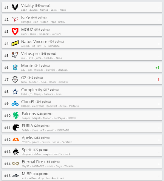 1-10名中Monte战队排名上升一名,G2排名下跌至第七。