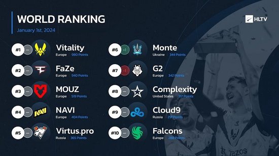 今日,HLTV更新了2024年第一周的世界排名,由于最近没有大型赛事处于休赛期阶段,所以TOP30排名都没有太大变化,TOP20里唯有G2与Monte互换位置。