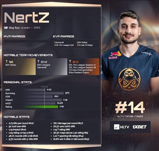 凭借出色的表现以及对ENCE的重大贡献,24岁的以色列枪男NertZ首次入选TOP20!