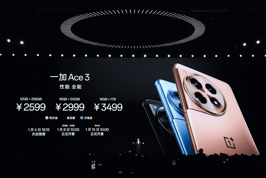 一加 Ace 3 星辰黑和月海蓝配色将于 1月 8日 10:00 正式开售,鸣沙金配色将于1 月 15 日 10:00 正式开售,售价 2599 元起。发布会上,一加同步发布了一加 Buds 3 耳机和一加 Ace 3 全包保护壳两款产品。