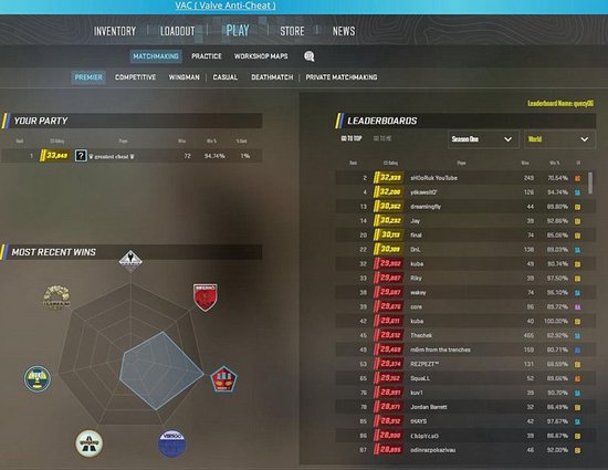 日前V社发起了新一轮的秋后算账,不少光鲜亮丽的账号喜提VAC。其中就包括Premier模式欧洲区段位第一人。后者有着32200分,胜率高达94.74%,最擅长的地图是Mirage。