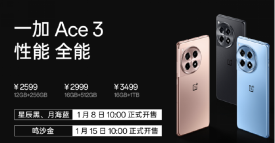 一加持续秉持「产品力优先」理念,让旗舰性能的全面普及,既有强大的产品力,也有极具诚意的价格。一加 Ace 3 星辰黑和月海蓝配色将于 1 月 8 日 10:00 正式开售,鸣沙金配色将于 1 月 15 日 10:00 正式开售,12GB+256GB 版本售价 2599 元,16GB+512GB 版本售价 2999 元,16GB+1TB 版本售价 3499 元。