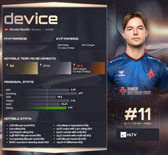 2023年对Astralis来说是相对艰难的一年,但他们的明星选手Nicolai Reedtz | device仍旧以世界一流的出色表现重返TOP20榜单。