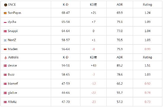 淘汰赛首轮进入到Astralis与Heroic的丹麦德比,device以1.67rating的绝佳表现带队先下一城,随后Buzz接过大旗,图二贡献30个人头数,帮助队伍锁定半决赛席位。但他们即将迎来本次旅途的终点——势不可挡的G2再一次将Astralis完全击溃。