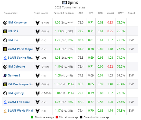 Spinx 2023年赛事数据,绿色为高于赛事平均5%以上,红色为低于平均5%以上,灰色为接近平均值