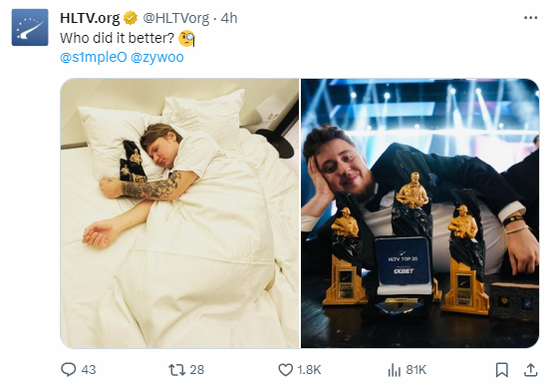 HLTV便将这张照片与s1mple斩获多项年度最佳时的合影进行对比,并询问大家:“谁的更好?”