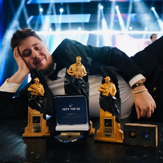 ZywOo在今年HLTV颁奖典礼上斩获年度最佳选手、年度最佳高光时刻、年度最佳狙击手三个奖项,并与三座小金人与TOP1奖牌合影记录下来。