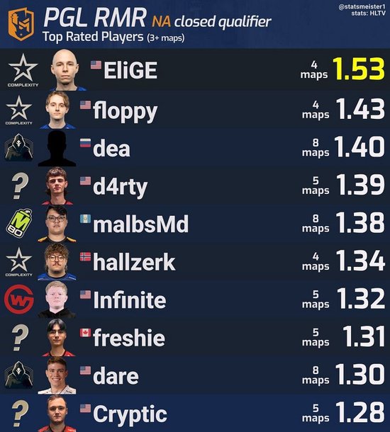 近日,国外的数据爱好者统计了PGL 哥本哈根Major RMR北美封闭预选赛的选手Rating榜单。