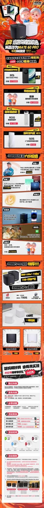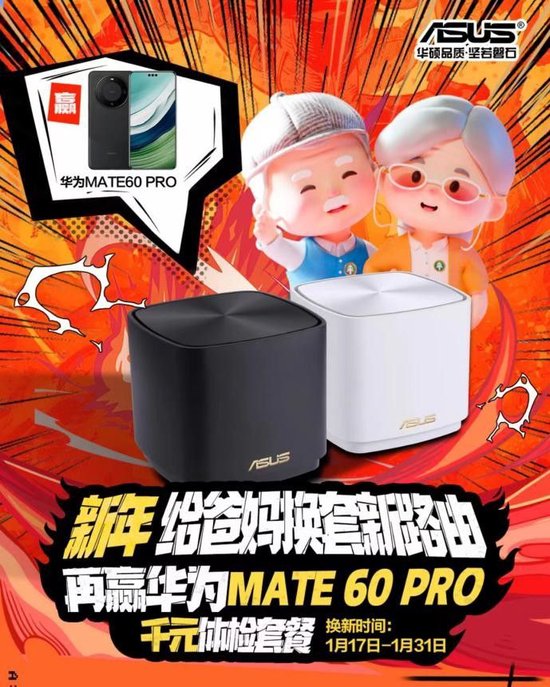 1月17日-1月31日,华硕网络京东官方旗舰店特别推出“新年给爸妈换套路由器”活动,选购华硕任意型号,参与小红书晒单,即有机会赢取华为价值7999元的MATE60 PRO、价值2999元的价值爱康国宾康乐体检套餐,还有价值199元的ROG智能保温杯以及价值50元的小飞侠组网神器优惠券等新年豪礼!