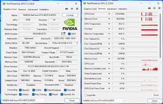 通过更新至最新的GPU Z 2.56版本,玩家们可以得到耕升GeForce RTX 4070 SUPER 星极皓月 OC中更为具体的参数表现和实际规格,通过数据我们可以看到显卡在待机状态下温度为39.3度,功耗为8.5W。