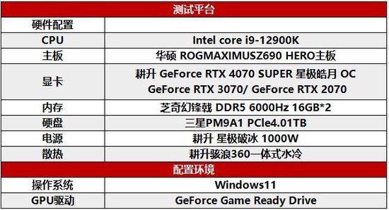 本次测试环节的CPU使用了Intel Core i9-12900K,主板方面选择了ROG MAXIMUS Z690 HERO主板,内存方面启用2条芝奇 幻锋戟 DDR5 6000Hz 16GB,电源采用的是耕升星极破冰1000W电源,散热方面则是耕升 骇浪360 一体式水冷,这套散热配置可以为GPU提供足够的降温以及供电 ,这套配置在正常使用中,可以完美的发挥耕升GeForce RTX 4070 SUPER 星极皓月 OC的性能,同时本次测试将同时与GeForce RTX 3070 和GeForce RTX 2070 进行直接比对,让我们来看看耕升GeForce RTX 4070 SUPER 星极皓月 OC的优越表现吧。
